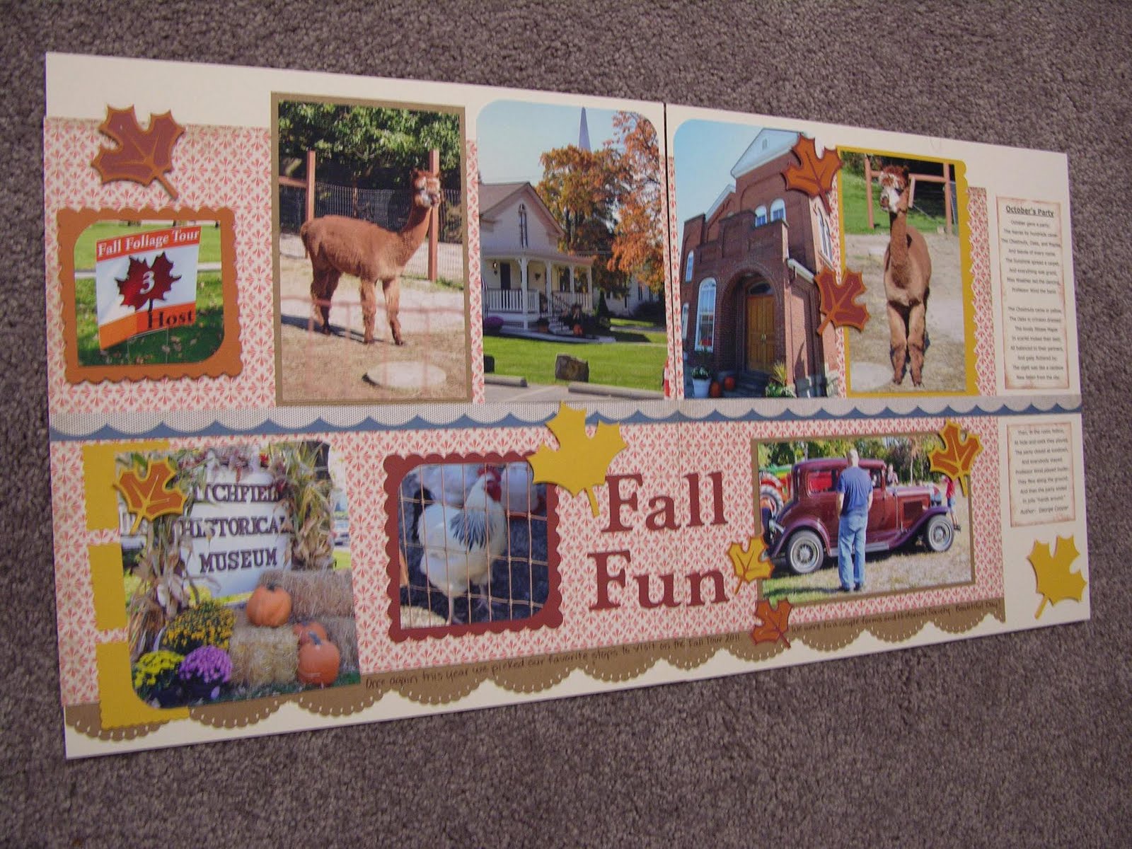 check out. We only picked 2 - 3 stops but it was a beautiful day and just perfect to be out touring the every day sites we miss. Not to mention, the color was indescribable. For this page I added a poem I found called, "October's Party". Sometimes I don't have alot of journaling for this as we go every year and the pictures are just sites we saw so a poem worked perfectly. I had SO much fun cutting out the leaves on my CTMH Art Philosophy Cricut Cartridge that I cut some extra to use for a card. The word "Fall" was actually a goof for my page as it was too large to fit in the spot I wanted. All good, it could go on my card. The card design is from this weeks Card Pattern's #141.Making the card was a great way to use up the scraps from the page. I added Glitz Glitter to some of the leaves to give it a little sparkle.